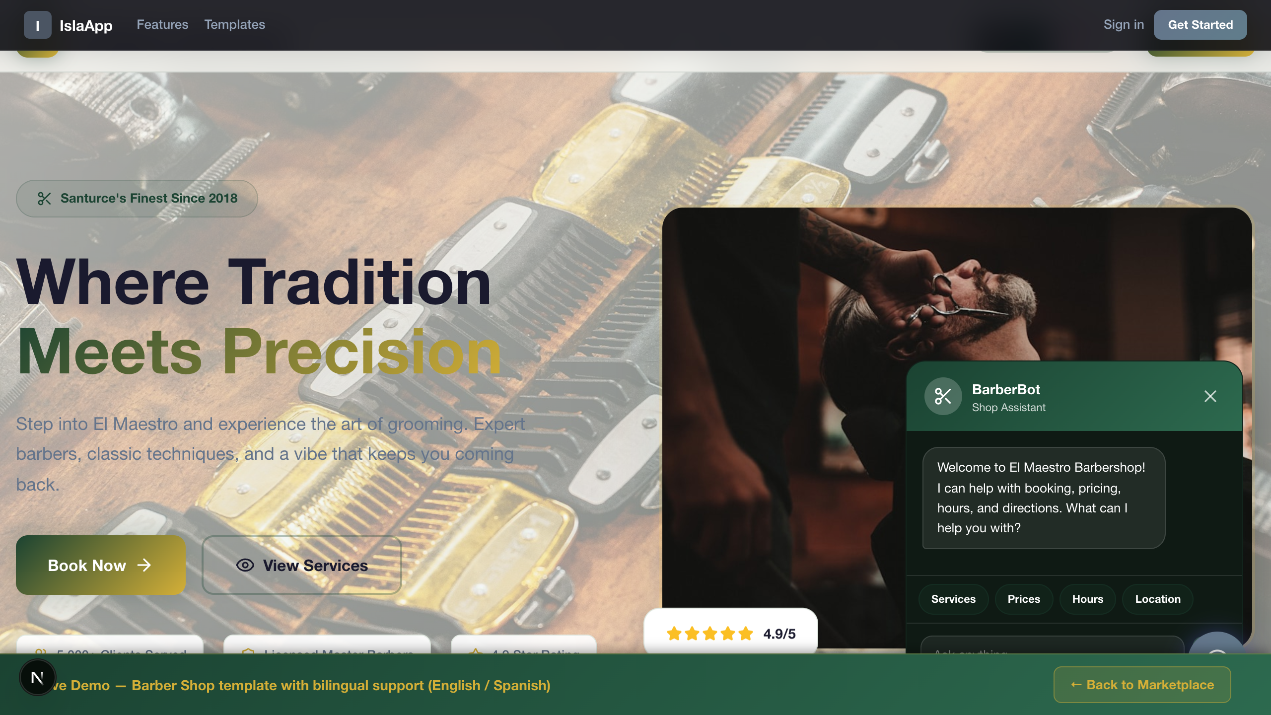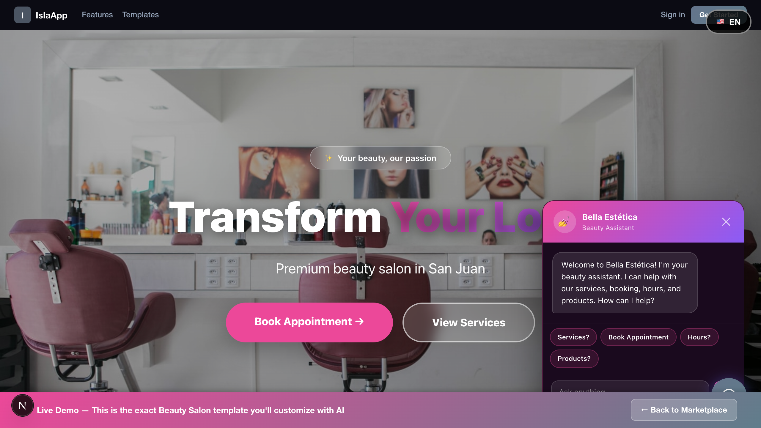 IslaApp is a template marketplace where businesses create professional websites using AI. Choose from 125+ industry-specific templates across 6 categories, customize them to match your brand, and publish with one click.